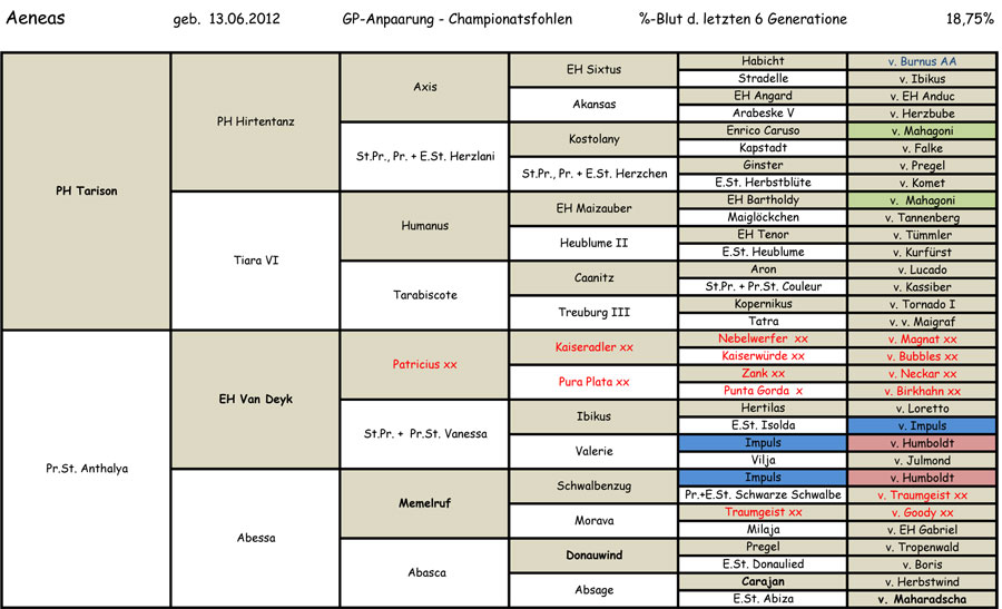 Aeneas war Reservesieger der Hengstfohlen im "Tarison-Ring" (erster Fohlenjahrgang des Vaters Tarison) beim Fohlenchampionat des Gestüts Hörstein im Juli 2012 Er war außerdem Teilnehmer beim Hessischen Fohlenchampionat in Kirchhain im September 2012 |